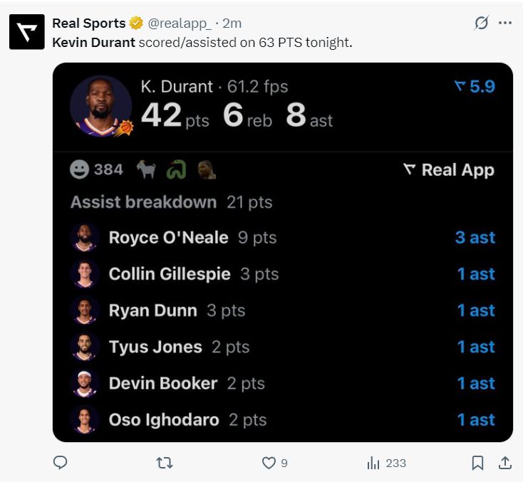 杜兰特通过个人得分+助攻换来了63分超过了全队的一半,这就是37岁老杜的能力。
