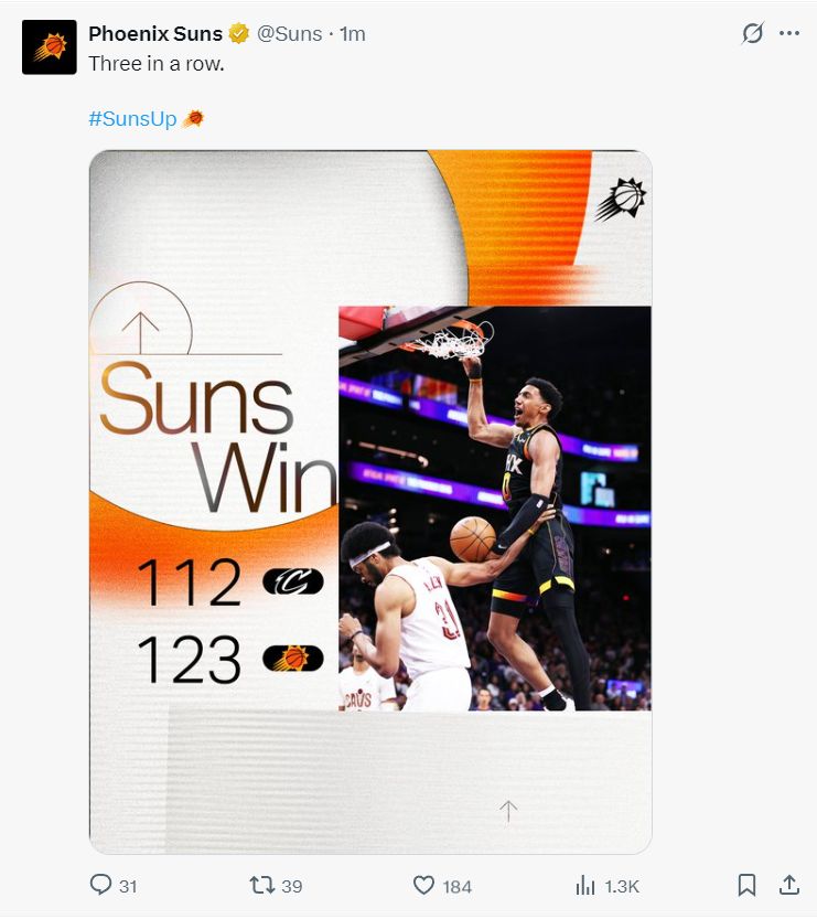 北京时间3月22日,太阳123-112击败骑士拿到三连胜,因为独行侠逆转了活塞,如果这场比赛太阳输球了,那么太阳会重新回到西部第十一,好在太阳击败了联盟第二+东部第一的劲旅骑士,太阳也挽回了一些尊严。