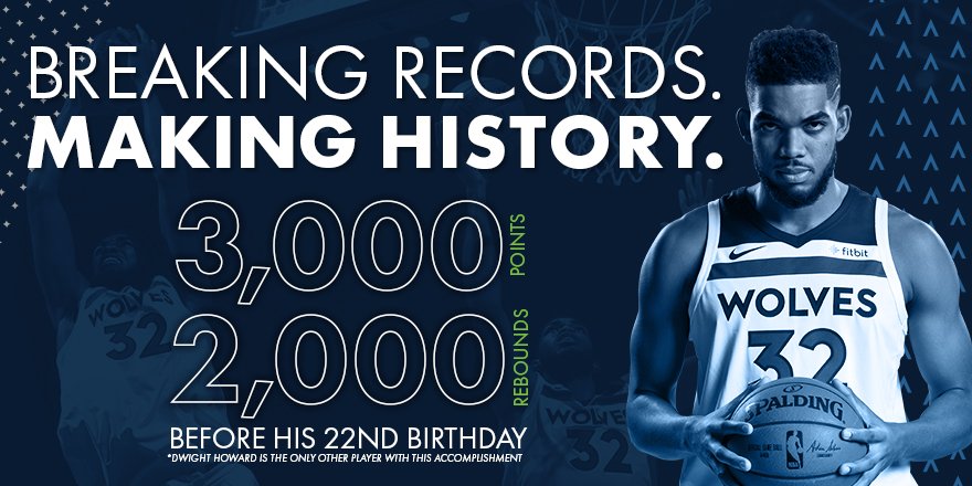 据森林狼官方统计,唐斯也成为了历史第2位在22岁生日以前得到至少3000分和2000个篮板的球员,德怀特-霍华德此前也曾做到过。