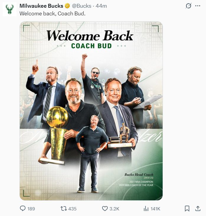 雄鹿官方欢迎布登霍尔泽回归密尔沃基,因为布登在这里拿到最佳主帅+总冠军。