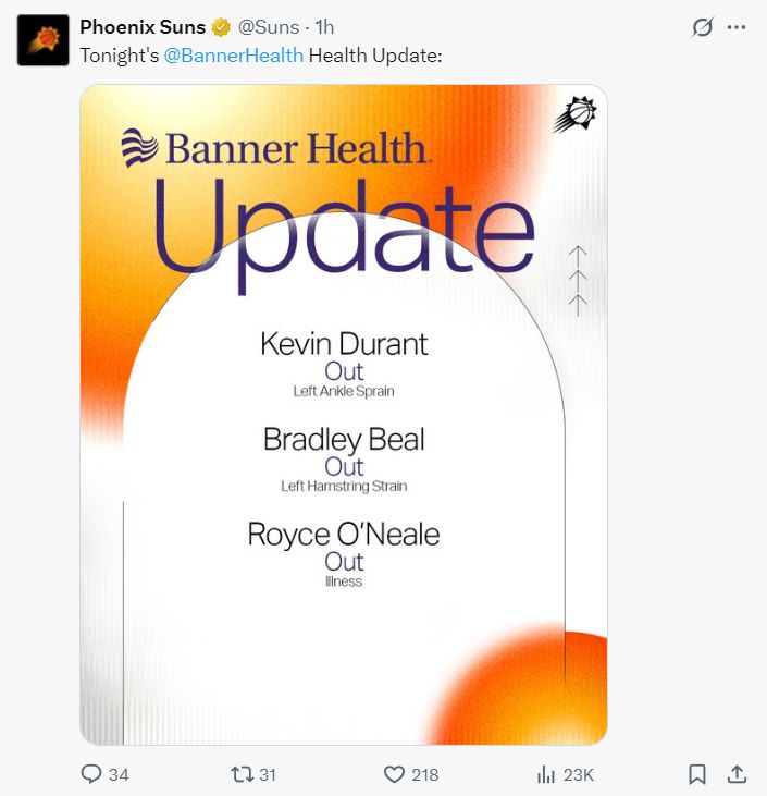太阳这边杜兰特、比尔、小奥尼尔都无法出战,雄鹿这边利拉德也是无法出战。