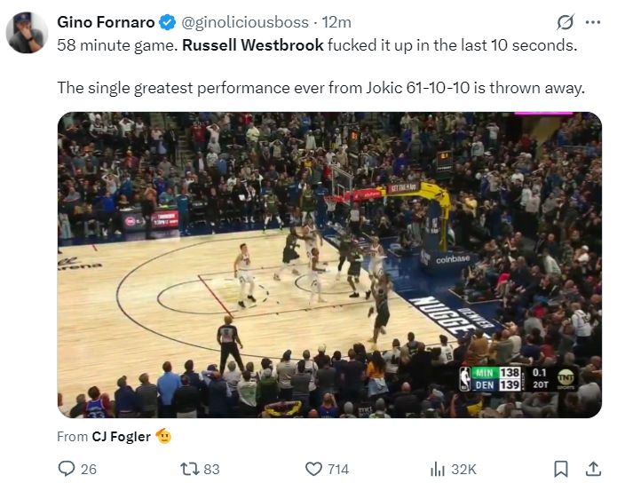 尼古拉-约基奇狂轰61分10篮板10助攻鏖战双加时还是输了,最终输1分,本赛季掘金被森林狼四杀,这场比赛可以说约基奇的统治力达到巅峰,全场罚球24个,森林狼全队才25个,这样的比赛都输了?拉塞尔-威斯布鲁克必须负全责。
