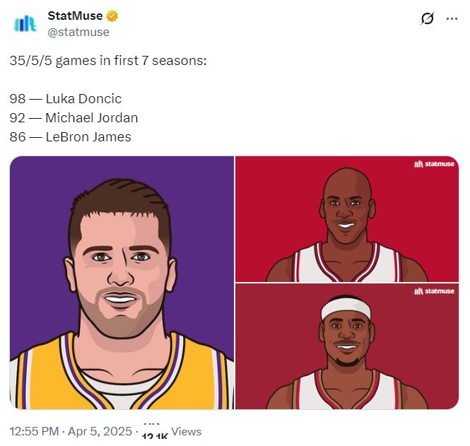 生涯前七个赛季,东契奇98次35+5+5比乔丹92次,詹姆斯86次还多。