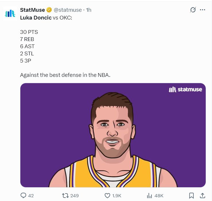 上半场东契奇就命中了5个三分球,霍姆格伦与哈尔滕施泰因挨个被军训,下半场雷霆开始包夹东契奇才使得他没有继续命中三分,但这就给了湖人其余的选手空位出手机会。数据媒体也是写:东契奇面对联盟最强防守打出如此表现。