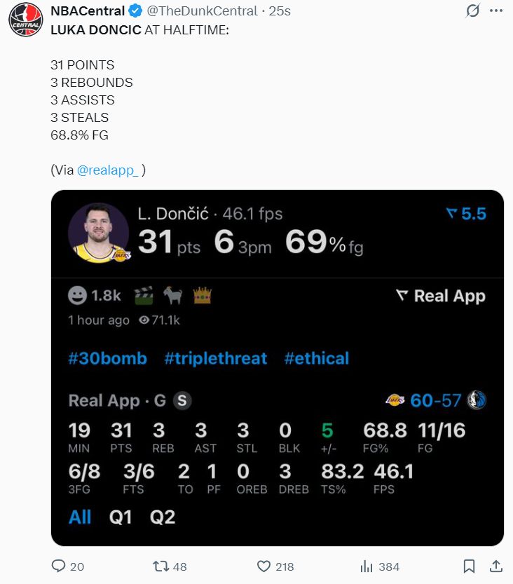次节,东契奇休息了4分半才登场,登场不到40秒连续两个突破打停独行侠。基德的ATO没有打乱东契奇的手感,东皇又是一个外线三分,反击助攻芬尼三分后已经反超5分,东皇突浓眉造犯规,东契奇面对克里斯蒂的长臂压哨三分也进,东契奇突马绍尔很轻松,东皇撤步三分再中,半场东契奇16中11+三分8中6拿到31分3篮板3助攻3抢断。