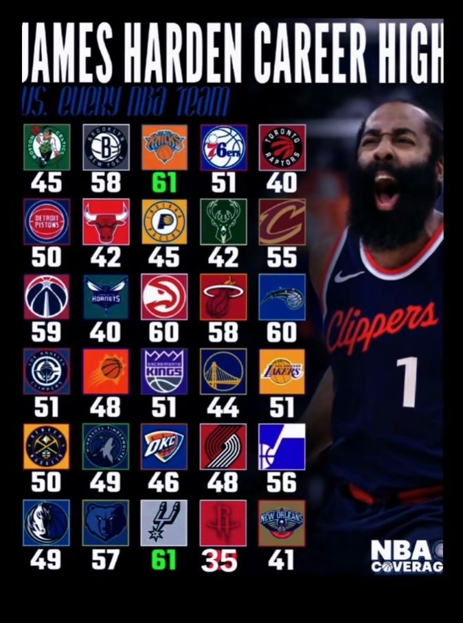 哈登就此达成面对联盟所有30队,均是轰下过30+与35+的全满贯壮举。如果将得分提升到40+,哈登面对联盟29队轰下40+,仅仅只有面对火箭尚未得到40+得分。此外,哈登生涯已经62次贡献至少35分10助攻,高居历史第二位,仅次于大O奥斯卡-罗伯特森121次。