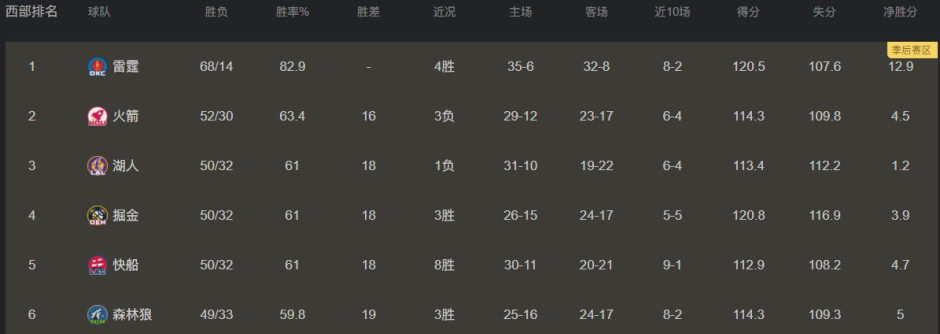 雷霆:68胜14负,连续两个赛季达到60+胜,创造队史单赛季最佳战绩纪录。