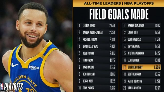 库里季后赛运动进球数,超越公牛6冠名宿皮蓬,升至季后赛历史第17位。