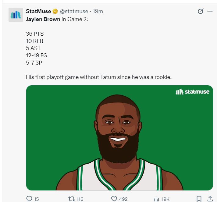 美媒NBA Memes写道:布朗在没有塔图姆的情况下拿到36+10+5,他让所有人知道FMVP的硬实力。
