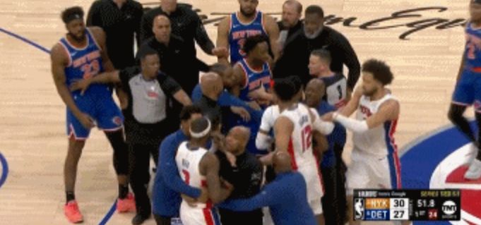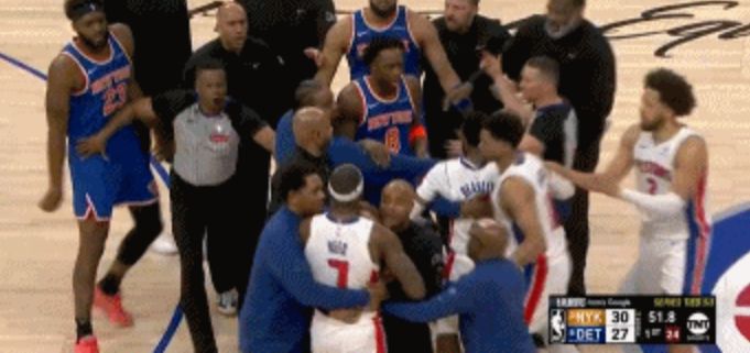 北京时间4月25日,尼克斯与活塞的首轮第三场比赛,双方在首节就多次爆发冲突。布伦森一度戳眼小哈达威被吹罚一级恶意犯规,唐斯推倒奥萨尔导致后者流鼻血,随后唐斯加入米罗与里德的冲突,导致3人吃T。