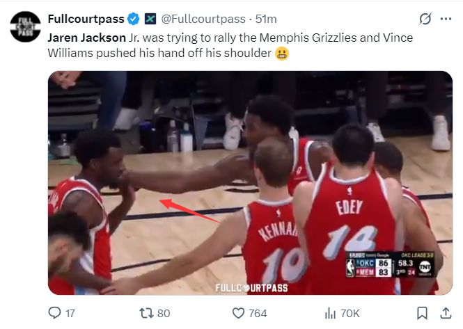 美媒FTP晒出小贾伦团结全队时文威一把推开他的手,写道三J试图凝聚全队,可文威一把推开了他的手。