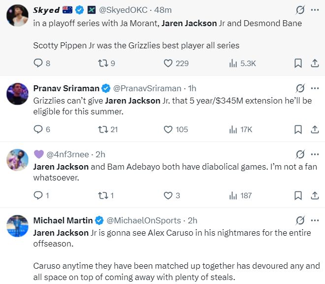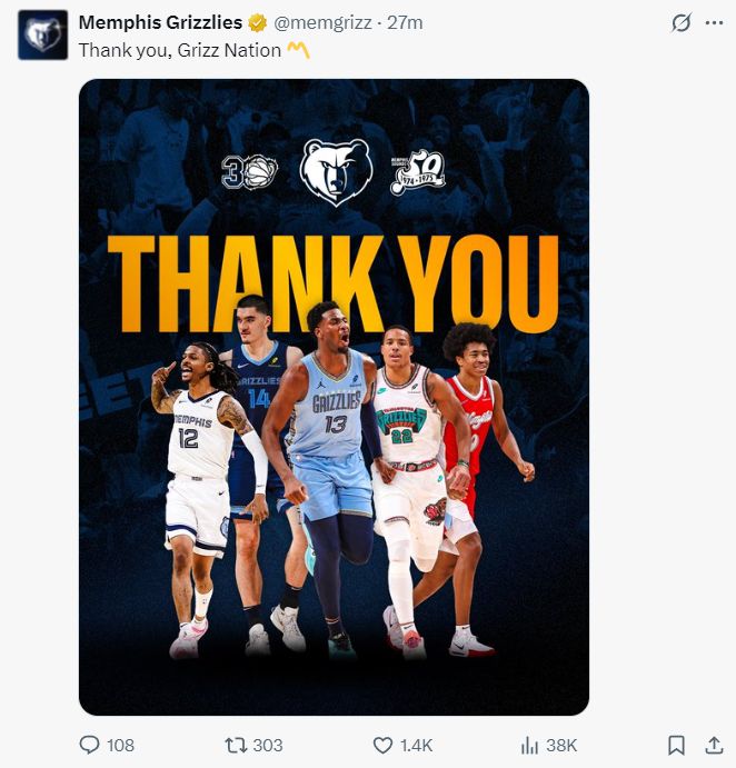 这场比赛后灰熊官方致谢了灰熊国度的球迷,站在C位的竟然是三J。这里要说一下,三J今夏有资格与灰熊提前续约,他如果拿到DPOY能签下五年3.45亿的超级顶薪,没有拿到DPOY只能签五年2.45亿。
