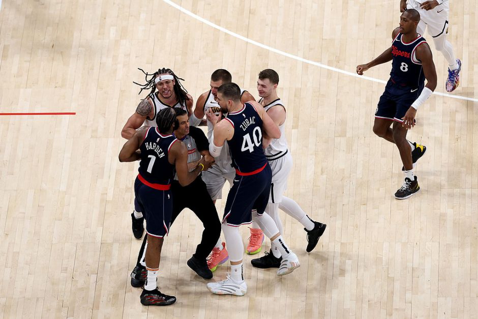船掘大规模冲突:约基奇哈登等6人吃T 戈登追打球迷集体喊驱逐