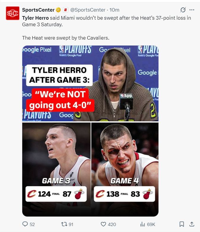 美媒还晒出热火0-3赛后希罗的言论——我们绝对不会被4-0横扫。