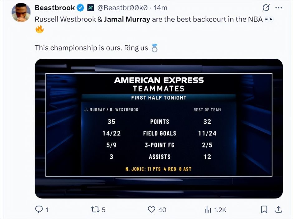 第二节穆雷压哨三分超时,可他单节5中4+三分2中1拿9分2助攻,半场穆雷已经拿到19分,他与威少两人合计拿到35分,球队其余的球员拿到32分,穆雷与威少成为掘金上半场的英雄。