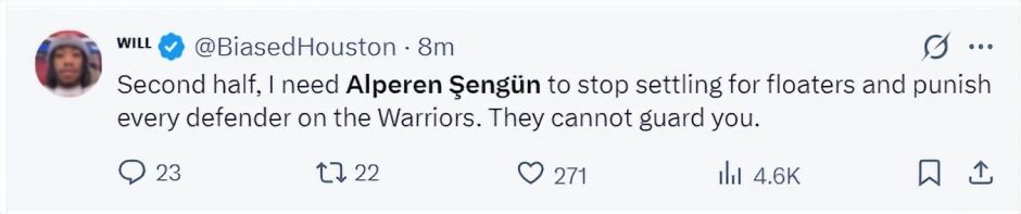 次节上来申京连续误攻,范弗利特两次的完美过人助攻他空位他未能命中,这一次申京是4中0,换言之开局4中4后已经是7中0,半场11中4还是8分,休媒:申京应该停止每一次的抛投,他应该持球打到篮下惩罚每一个勇士矮个防守者。