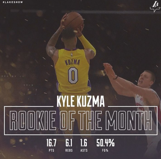 “官方:@凯尔-库兹马当选西部月最佳新秀!#KuzControl”湖人官方写道。