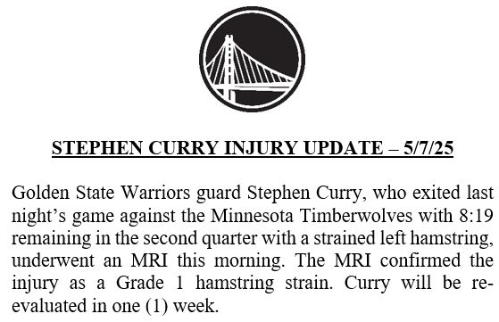 北京时间5月8日,勇士官方宣布,经过核磁共振检查,库里确诊为一级腿筋拉伤,将在一周后重新接受伤情评估,至少连续缺阵三场比赛,最早也得在明尼阿波利斯举行的第五场比赛中复出。