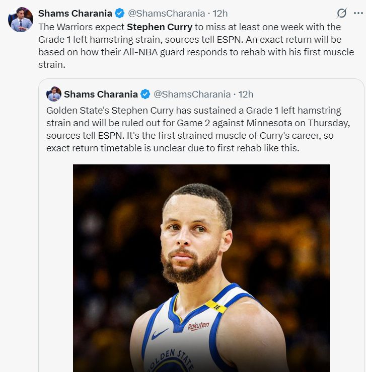 随后ESPN记者查拉尼亚透露,库里至少要缺席一周,一周后重新检测评估才可能回归,库里是否能在一周后回归要看他的康复状态。
