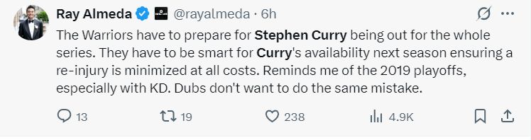 美记Ray Almeda写道:勇士队必须在库里缺席的系列赛里做出调整。为了库里下赛季的健康,他们必须聪明一点,要不惜一切代价等库里完全康复再登场,把库里再次受伤的风险降到最低。这让我想到了2019年季后赛的杜兰特,杜博斯不该再犯同样的错误。