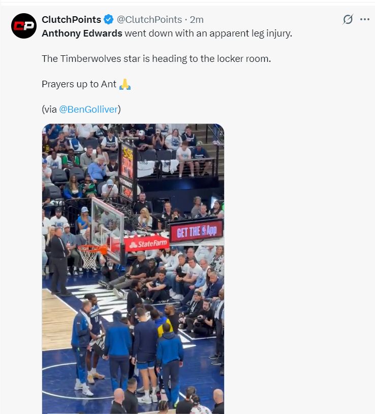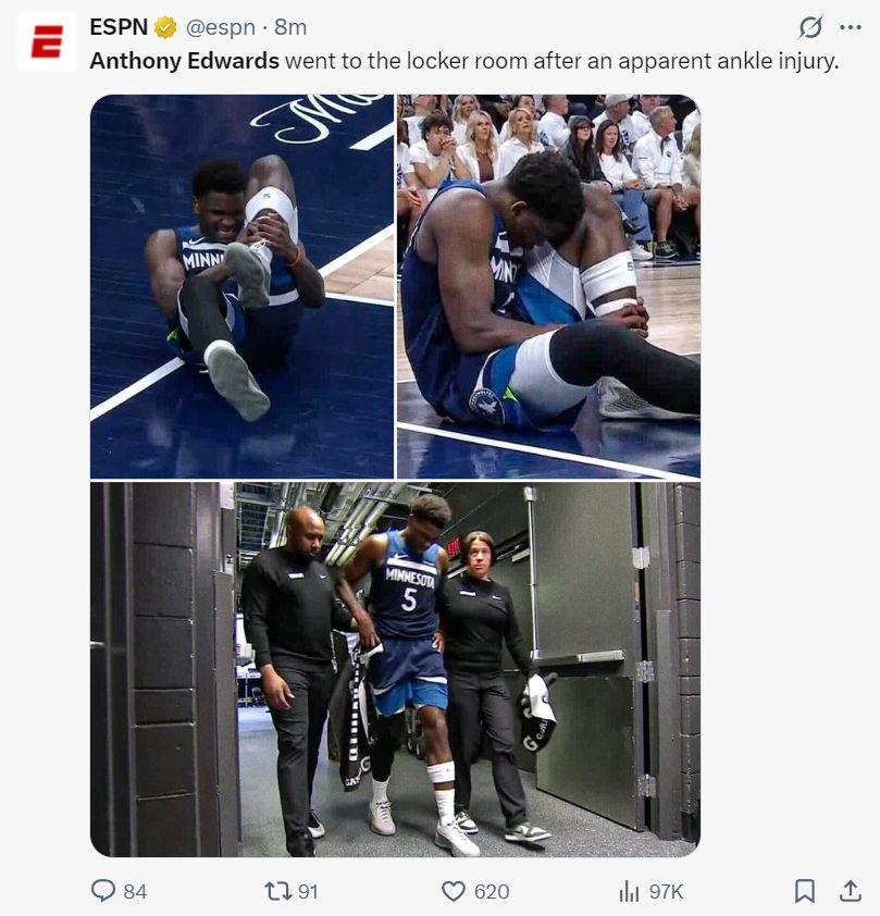 芬奇暂停后,森林狼队医立马就进场为爱德华兹检查,全场的球迷也在为蚁人华子祈祷。