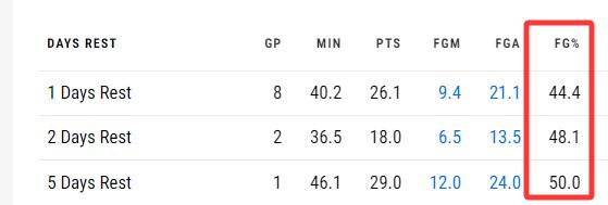 数据显示,约基奇或许真的累了,休息时间还是对命中率有不小的影响。约基奇已经打的11场季后赛,有8场只休息1天,这8场的命中率是44.4%,休息2天的两场比赛,约基奇的命中率是48.1%,而休息5天的一场比赛,他的命中率是50%。约基奇的体能确实面临严峻的考验。