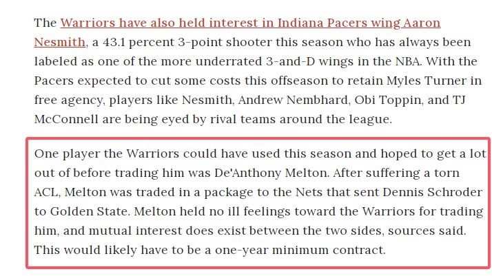 勇士这个赛季开局原本非常不错,陷入困局就是从梅尔顿受伤赛季报销开始的。后来勇士换来施罗德,又换来巴特勒,积极进行调整。勇士这个夏天除了补强中锋外,如果能迎回梅尔顿,那就是好上加好。