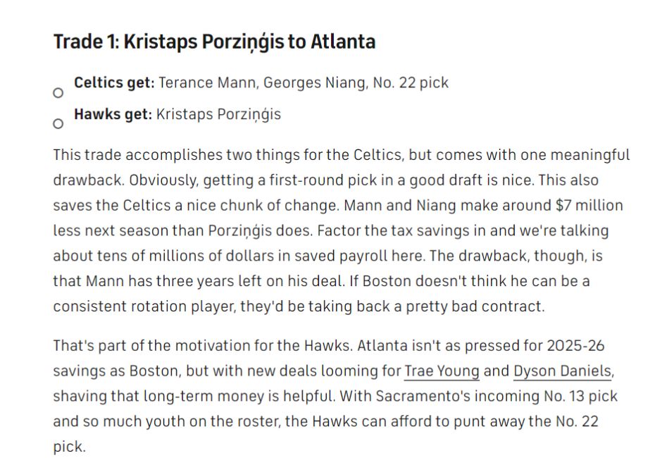 这笔交易是为了节省700万的薪金空间,尼昂+曼恩的合同还比波尔津吉斯下赛季少700万,700万也可以为绿凯减轻高昂奢侈税重罚,而老鹰则得到一个他们心心念念的空间型五号位。