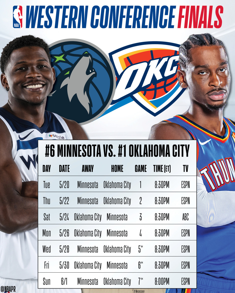 NBA新王登基在即!西部巅峰对决上演超级后卫之战,亚历山大与爱德华兹将用爆炸得分能力书写传奇,雷霆74%晋级概率能否碾压森林狼?拭目以待这场火星撞地球的较量。下面给大家分享2025NBA西决赛程时间表