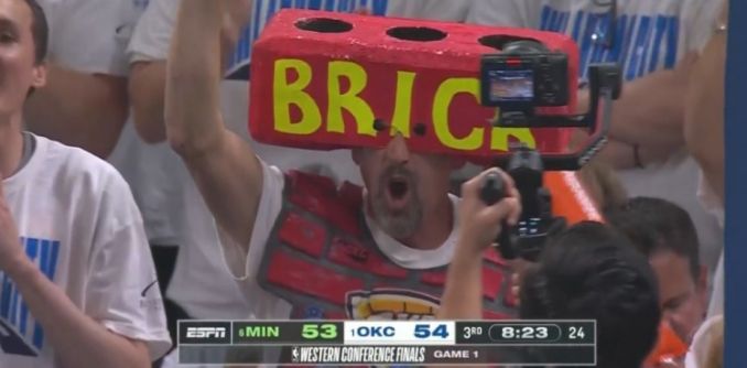 雷霆主场球迷夸张头顶砖头造型干扰森林狼球员,单词意为“打铁”。