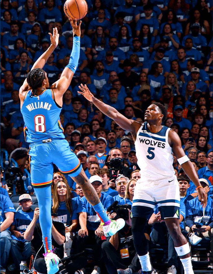 开场SGA就让主场球迷兴奋不已,三次出手全部命中,无差别单打让芬奇防无可防;霍姆格伦首节5中2拿8分2篮板2助攻也火力十足,杰威三个中投都命中单节也拿到6分2篮板,雷霆三少都发挥了。森林狼发挥最稳定的兰德尔彻底哑火,爱德华兹8分6篮板3助攻,麦丹6分。