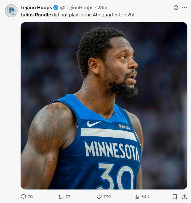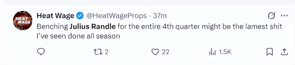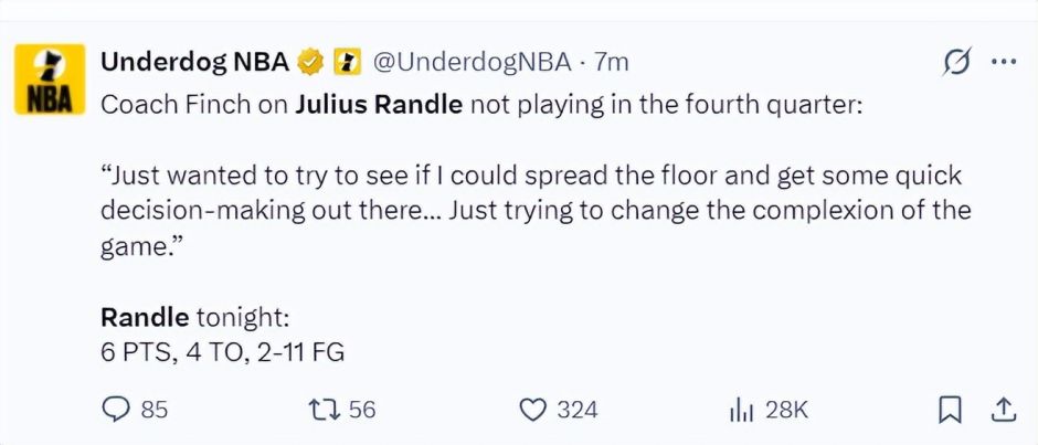 这场比赛有一个细节,朱利叶斯-兰德尔在末节没有获得登场时间,他直接被芬奇给弃用了。