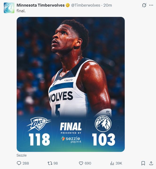 北京时间5月23日,森林狼103-108惨败雷霆,西决大比分0-2落后。他们将回到明尼阿波利斯备战最关键的西决G3,如果G3再输球那么就等于是坐等出局的局面了,因为NBA历史上还没有0-3翻盘的纪录。