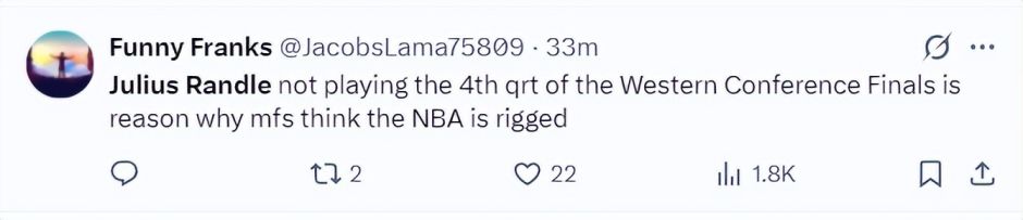 美球迷 :兰德尔西决G2第四节无法登场,这正是NBA被操控的原因之一。
