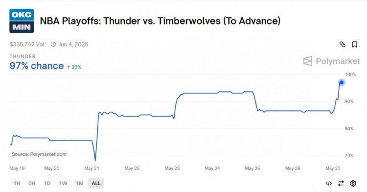 新版雷霆三少已经一只脚踏进了总决赛。根据数据媒体Polymarket Hoops实时统计,目前雷霆冲进总决赛的概率高达97%,森林狼翻盘希望渺茫。新版雷霆三少,有希望比当年的杜兰特、威少和哈登走得更远,因为当年的三少碰上的是拥有三巨头的热火,而如今东部决赛的两支球队是步行者和尼克斯,论纸面上的实力,都不如雷霆。