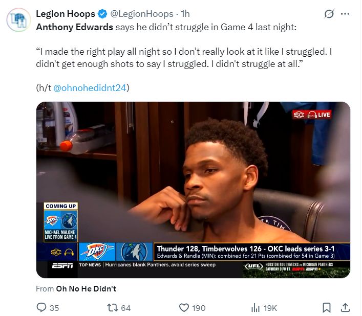 NBA记者凯文-奥康纳则表示爱德华兹在关键的G4中13中5+5失误太拉胯,尤其是G3大爆发的情况下令人大失所望。