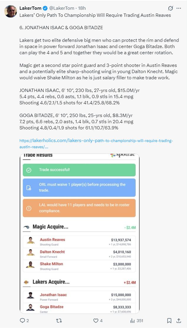 他的第一笔模拟交易的对象是奥兰多魔术队,湖人得到:乔纳森-艾萨克、戈加-比塔泽;