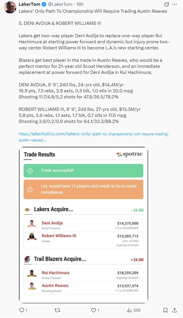 第二笔交易对象是开拓者,这一组交易应该是最佳方案,湖人送出里夫斯+八村垒换来阿夫迪亚+罗威。只要罗威能保持健康他绝对是联盟最顶级的先发五号位之一 ,阿夫迪亚更是能打持球、无球的超级前锋,完美契合任何体系。