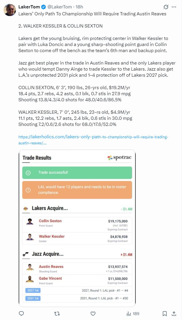 第五笔是与爵士交易,湖人送出里夫斯、文森特、2027年首轮签、2031年首轮签,换来塞克斯顿、凯斯勒。这笔交易提升就很大了,塞克斯顿打第六人,凯斯勒成为湖人新的先发五号位。