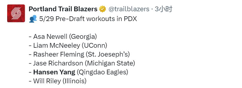 开拓者多位队记报道了球队的首日试训名单,并表示名单上的球员都是潜在的首轮秀。毫无疑问,杨瀚森在联合试训的表现已经征服不少人,选秀行情看涨,在不少球队记者眼中,他是有可能在首轮被选中的球员了。