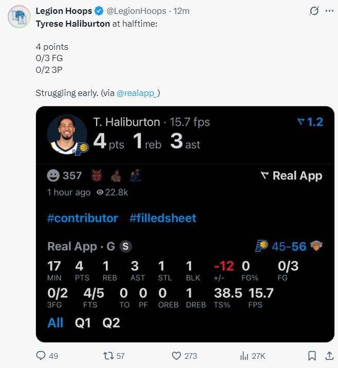 次节哈利伯顿被换上后打了足足4分钟才以罚球拿到第二节的第一分,随后哈利伯顿只出手了一个超远的压哨三不沾,单节哈利伯顿7分钟1中0拿2分2助攻1抢断1盖帽,半场3中0拿4分1篮板3助攻1抢断1盖帽,这与G4的表现判若两人。