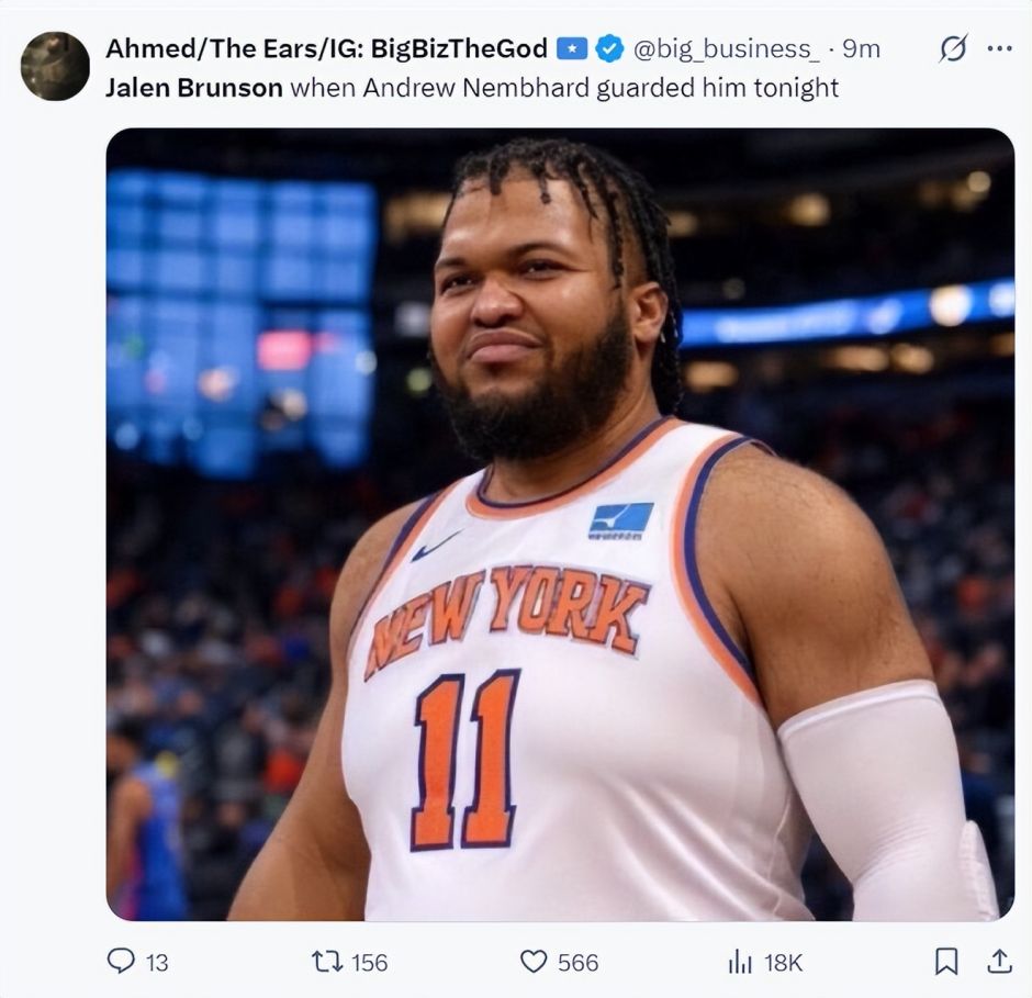 第二节布伦森出现了一个争议时刻,他先是主动与内姆布哈德有身体接触,随后内姆布哈德贴着他,他与内少有推搡,结果裁判给了内少犯规,布伦森第二节被限制的很惨3中1+罚球2中1拿3分2助攻,整个上半场布伦森只有2个罚球。
