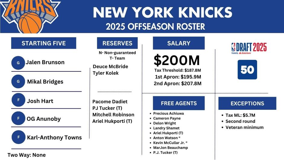 尼克斯的核心轮换:布伦森、阿奴诺比、布里奇斯、唐斯、米罗、麦克布莱德、哈特等人都还身背合同,他们秀撒气要如何运作令人期待。