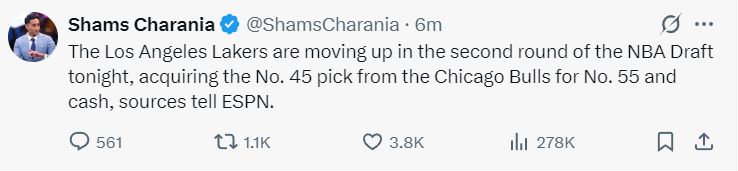 北京时间6月27日,ESPN名记Shams报道,洛杉矶湖人队与芝加哥公牛队达成一笔交易,湖人将次轮55号签+部分现金送到公牛换回了次轮45号签。
