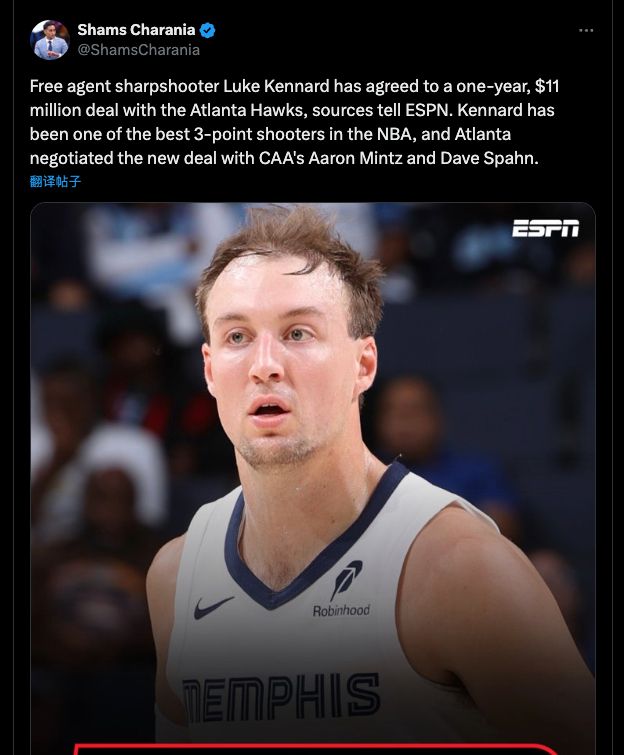 北京时间7月1日,根据名记Shams报道,前灰熊神射手肯纳德离开孟菲斯,他以1年1100万美元加盟老鹰。肯纳德加盟老鹰的原因是特雷-杨亲自招募,而此前亚历山大-沃克4年6400万美元签约老鹰,也有特雷-杨招募的功劳。