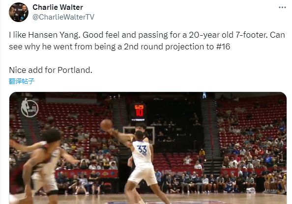 勇士跟队记者查理·沃尔特被杨瀚森的表现征服了,他在推特上写道:“我喜欢杨瀚森。对于一个20岁的7英尺球员来说,他的手感和传球都很棒。我能理解为什么他从第二轮的预测升到了第16位。对波特兰开拓者来说,这是一个不错的补充。”
