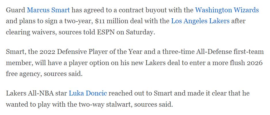 太阳和雄鹿也追求过斯马特,而他最终决定前往湖人,当东契奇和詹姆斯的帮手。根据另外一位NBA记者大卫·阿尔德里奇的报道,湖人最初的目标是安东尼·梅尔顿,希望引进他填补外线防守空缺,但根据消息人士透露,梅尔顿现在的名字和勇士联系在一起,尽管目前还没有签约。
