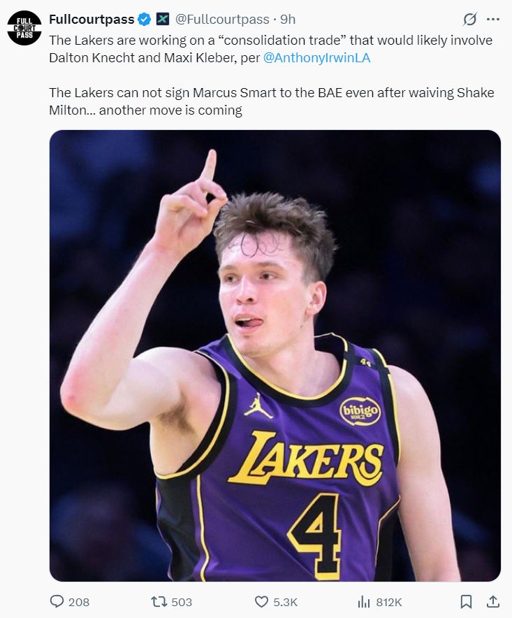 随后湖人记者安东尼-劳瑞恩透露,湖人正在秘密筹划一笔交易,这笔交易可能会涉及克内克特、克勒贝尔两人,此举是为了清理薪金空间来签下斯马特。