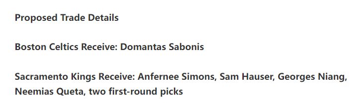 FW建议绿凯用安芬尼-西蒙斯、豪瑟、尼昂、克塔、2个未来首轮签从国王手中换来小萨。
