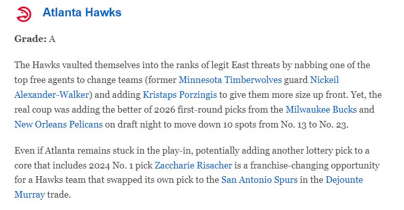 ESPN的评语就是:老鹰通过签换得到顶级自由球员亚历山大-沃克,还引进了波尔津吉斯增加前场尺寸,签下顶级投手肯纳德,用13号签换来23号签与2026年雄鹿首轮签。老鹰用德章泰-穆雷的交易为他们开辟了新的道路,2024年状元里萨谢已经成为合格先发,老鹰绝对迎来新的机遇。